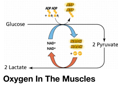 Read more →Oxygen In The Muscles How Low Oxygen Contributes To Fatigue Oxygen is used in so many process in the body. Every cell in the body contains mitochondria that uses oxygen to convert glucose (sugar) into energy. This process is called cell respiration. When oxygen falls below optimal levels such as during exercise or physical exertion normal aerobic cell respiration will switch to a less efficient method of converting glucose to energy called lactic acid fermentation. This is a type of anaerobic cell respiration which does not require oxygen. A by product of anaerobic cell respiration is lactic acid, which will ...